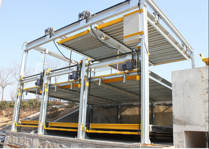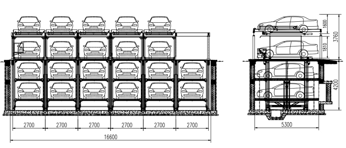 The equipment is designed as 2, 3 or 4 levels automatic puzzle parking system, one or two levels are above ground, and one or two levels are underground in a pit. There is an empty space on the upper level for exchange. The spaces of down level can shift up and down automatically, and the spaces of the upper levels can slide horizontally automatically. When the pallets run to the ground level, then cars can be parked or driven out.